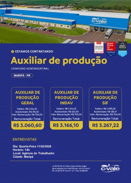 Os interessados devem comparecer à Agência do Trabalhador com documentos pessoais. As entrevistas serão realizadas diretamente por representantes da C.Vale, facilitando o contato entre empresa e candidatos.