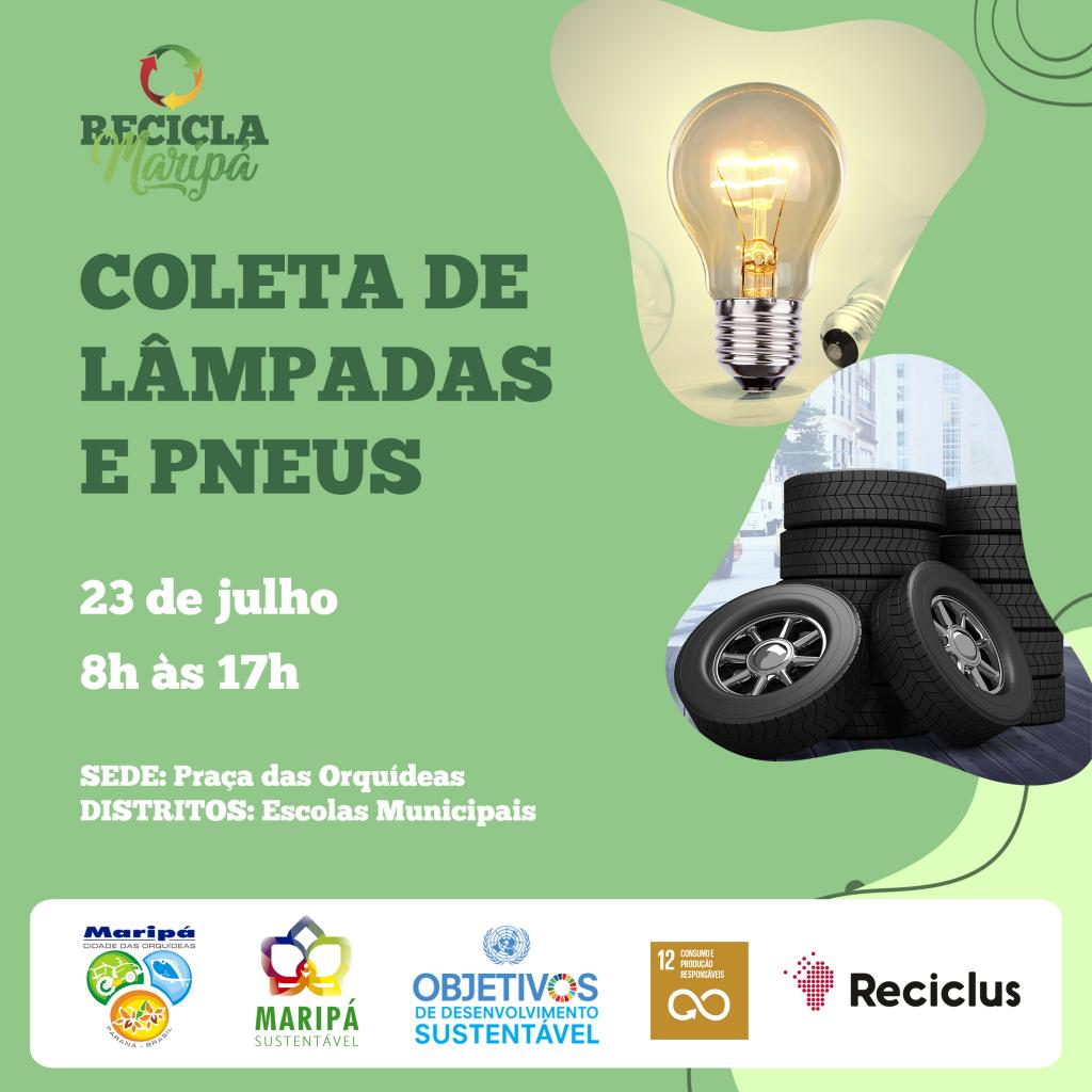 Lançada este ano, a campanha para coleta de lâmpadas e pneus tem a sua primeira data definida. Os materiais serão recolhidos no dia 23 de julho, das 8h às 17h, na Praça das Orquídeas e nas Escolas Municipais dos distritos de Candeia e Pérola Independente.