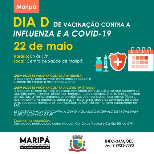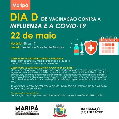 Com o objetivo de intensificar a imunização dos grupos prioritários, a Secretaria de Saúde de Maripá realiza neste sábado (22) o Dia D de vacinação contra a Influenza e contra a Covid-19. A aplicação será das 8h às 17h, no Centro de Saúde da sede do município. É necessário apresentar a Carteira de Vacinação, documentos pessoais e a declaração médica para as pessoas com comorbidades.