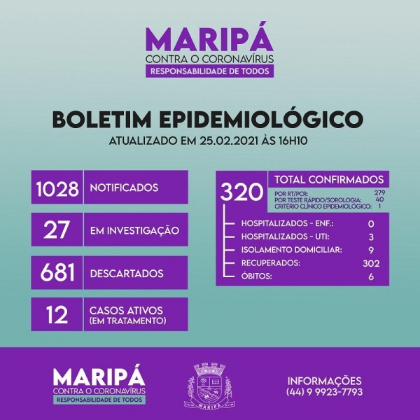 Desde o início da pandemia, em março de 2020, Maripá soma 1028 casos notificados da doença, sendo 320 deles confirmados, 681 descartados e 6 óbitos.