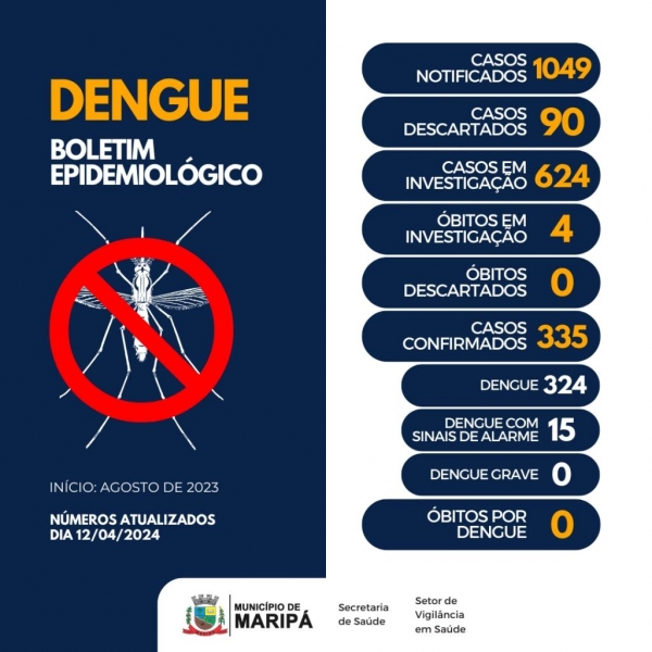 Ao todo, desde agosto do ano passado, o município registrou 1.049 casos, sendo 335 deles confirmados, 90 descartados e 624 em investigação. Além disso, 15 casos confirmados possuem sinais de alarme, ou seja, risco de evoluir para complicações.