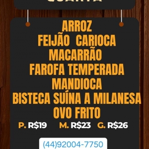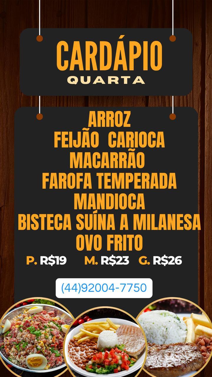 O Ponto da Marmita preparou um cardápio especial para hoje, quarta-feira (25), com marmitas quentinhas, bem servidas e com aquele sabor caseiro que conquista. Os clientes podem escolher entre três tamanhos: P (R$ 19), M (R$ 23) e G (R$ 26).