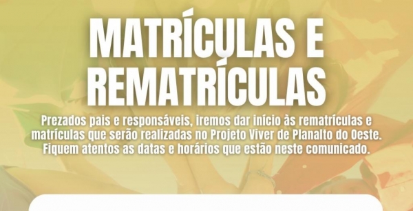 A Secretaria de Assistência Social de Nova Santa Rosa informa que serão realizadas, nos dias 27 e 28 de novembro, as matrículas e rematrículas do Projeto Viver de Planalto do Oeste. Pais e responsáveis devem ficar atentos às datas, horários e à documentação necessária para efetivar o processo.