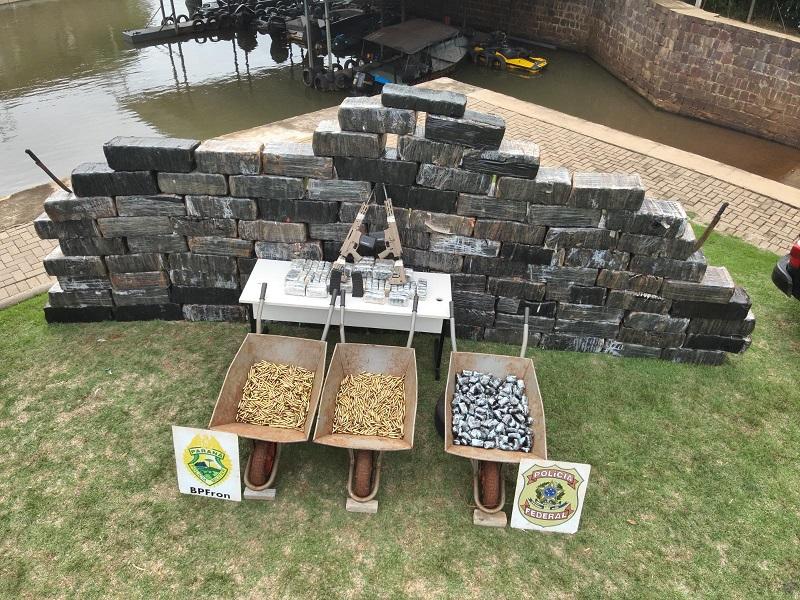 Durante uma ação integrada realizada nesta terça-feira (15), agentes do Batalhão de Polícia de Fronteira (BPFron), da Polícia Militar do Paraná, e do Núcleo Especial de Polícia Marítima da Polícia Federal (NEPOM/PF), apreenderam uma grande quantidade de entorpecentes e armamentos na zona rural de Mercedes, no Oeste do Paraná.
