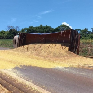 Parte da carga de soja ficou espalhada sobre a rodovia. Por sorte o motorista não resultou com ferimentos. Uma equipe da Polícia Rodoviária Estadual - PRE, posto de Santa Helena, foi acionada e registrou o sinistro.