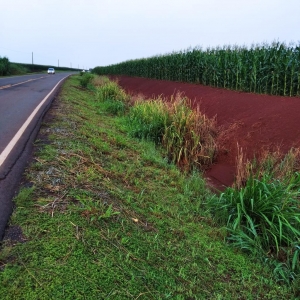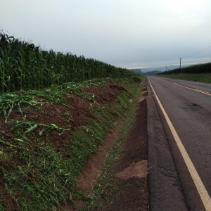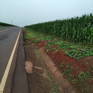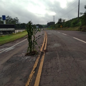 Indignado com os buracos na pista, um trabalhador, usuário da rodovia PR-491 que liga os municípios de Nova Santa Rosa a Marechal Rondon registrou na manhã de hoje pés de milho plantado nos buracos no meio da pista, nas proximidades da fecularia da Agrícola Horizonte.