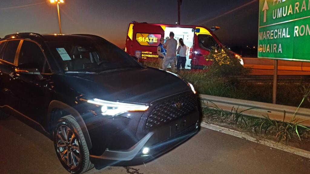 A batida envolveu um veículo Toyota Corolla e uma moto Honda Biz. O motociclista, homem de 45 anos teve suspeita de fratura no braço, sendo encaminhado para o hospital Bom Jesus.
