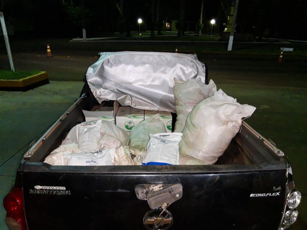 Sendo constatado que se tratava de uma GM / Montana licenciado em São Paulo/SP e que a mesma estava carregada com 150 Kg de agrotóxicos em pacotes e 60 litros de agrotóxicos em galões de origem Paraguaia sem os documentos fiscais necessários.