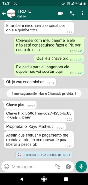 Na manhã de hoje, durante uma nova ligação e também trocas de mensagens, o suposto parente conversou com o nova-santa-rosense dizendo que o carro estragou entre os municípios de Assis e Toledo, o numero de um telefone de uma certa mecânica foi passado para confirmar que o carro realmente estava precisando de consertos.