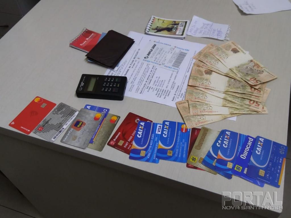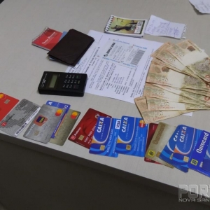 Os policiais revistaram o elemento e encontraram no bolso um bilhete de jogo de dupla Sena e três cartões de banco em nome de uma mulher e mais R$ 600,00 reais em dinheiro.