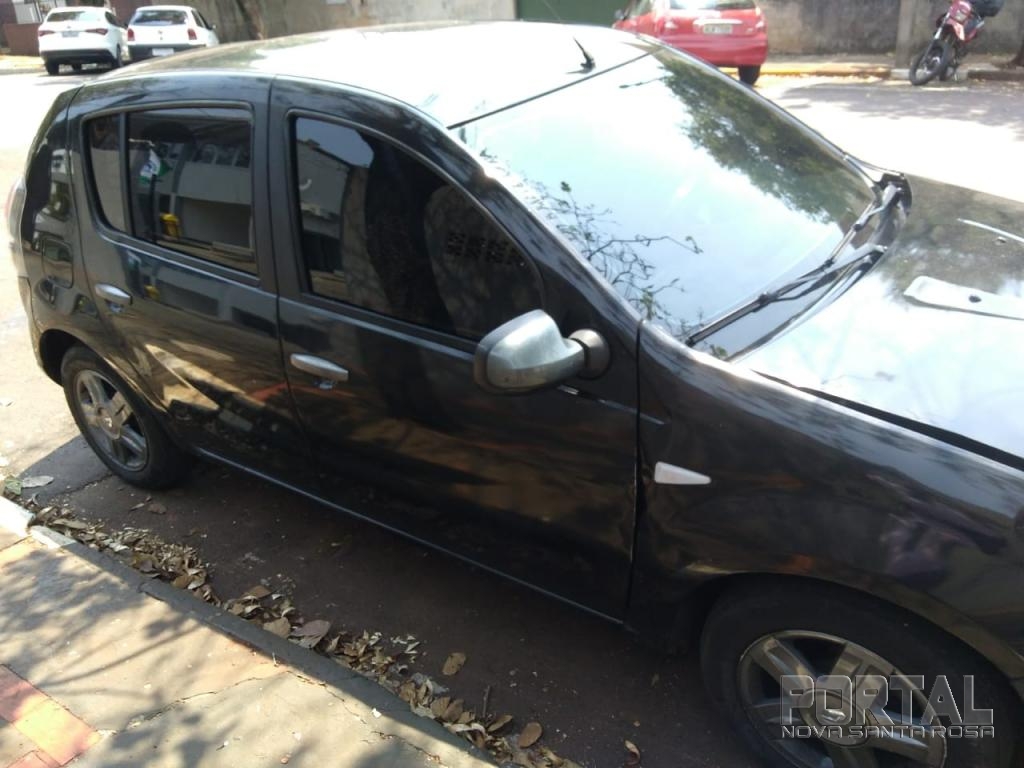 Os policiais se deslocaram até a agencia Fipal Veículos e abordou um Renault Sandero de cor preta de placa: IUZ-5h41 que no seu interior havia um indivíduo e uma senhora.