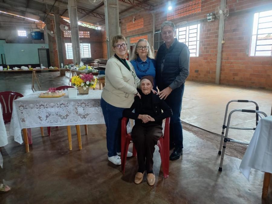 Integrantes do clube de idosos, familiares, a coordenadora Anilda Grieger, e os diretores da Secretaria de Assistência Social de Marechal Cândido Rondon, Lurdes Confetti e Valdir Sachser (Valdirzinho), participaram da homenagem para aniversariante, que em poucos dias vai celebrar 101 anos de vida.