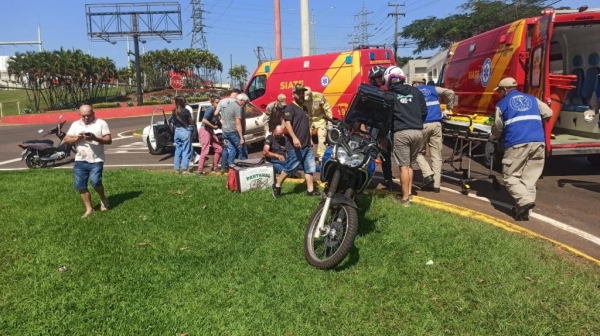 Um motociclista de 40 anos resultou com ferimentos moderados após um acidente entre carro e moto no início da tarde desta quarta-feira na rotatória da avenida Senador Atílio Fontana com Rua dos Pioneiros próximo ao bairro César Park em Toledo.