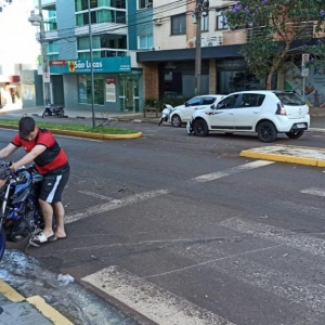 Na tarde desta quarta-feira, o veículo Renault Sandero com placas de Cascavel conduzindo por uma mulher e uma moto Yamaha de 300 cilindradas placa Mercosul conduzido por um rapaz de 22 anos colidiram na rua Guarani esquina com a rua Criciumal no La Salle em Toledo.