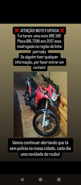 A comunidade da Linha Petrosky, no interior de Nova Santa Rosa, amanheceu com a notícia do furto de uma moto Honda XRE 190, placa BBL-7296, ano 2017. O proprietário percebeu o desaparecimento durante a madrugada e rapidamente pediu apoio da população para ajudar nas buscas.