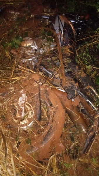 Devido a chuva e a quantidade de barro só foi possível retirar a moto do local onde estava escondida com o auxílio de um trator.