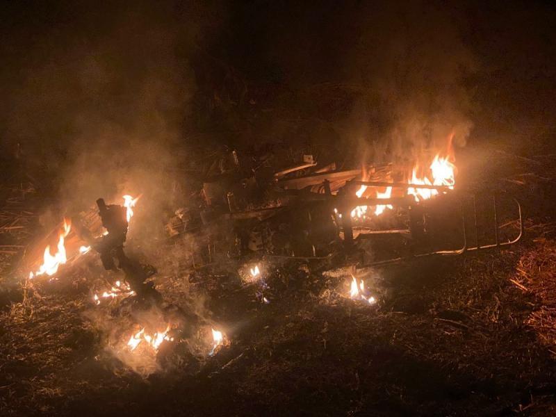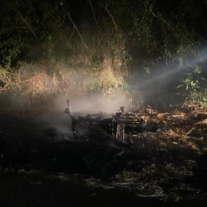 Uma moto ficou destruída após pegar fogo, na noite da segunda-feira (17), na saída de Mercedes para Três Irmãs.