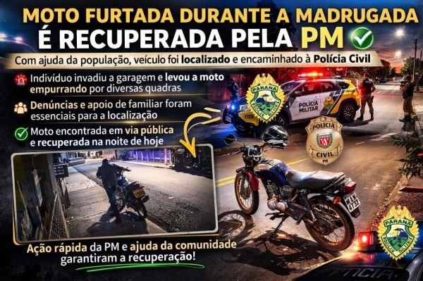 Uma motocicleta levada da garagem de uma residência durante a madrugada de quinta-feira (26) foi recuperada ainda na noite do mesmo dia, em Palotina.