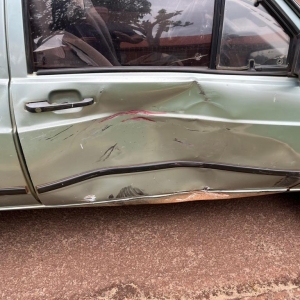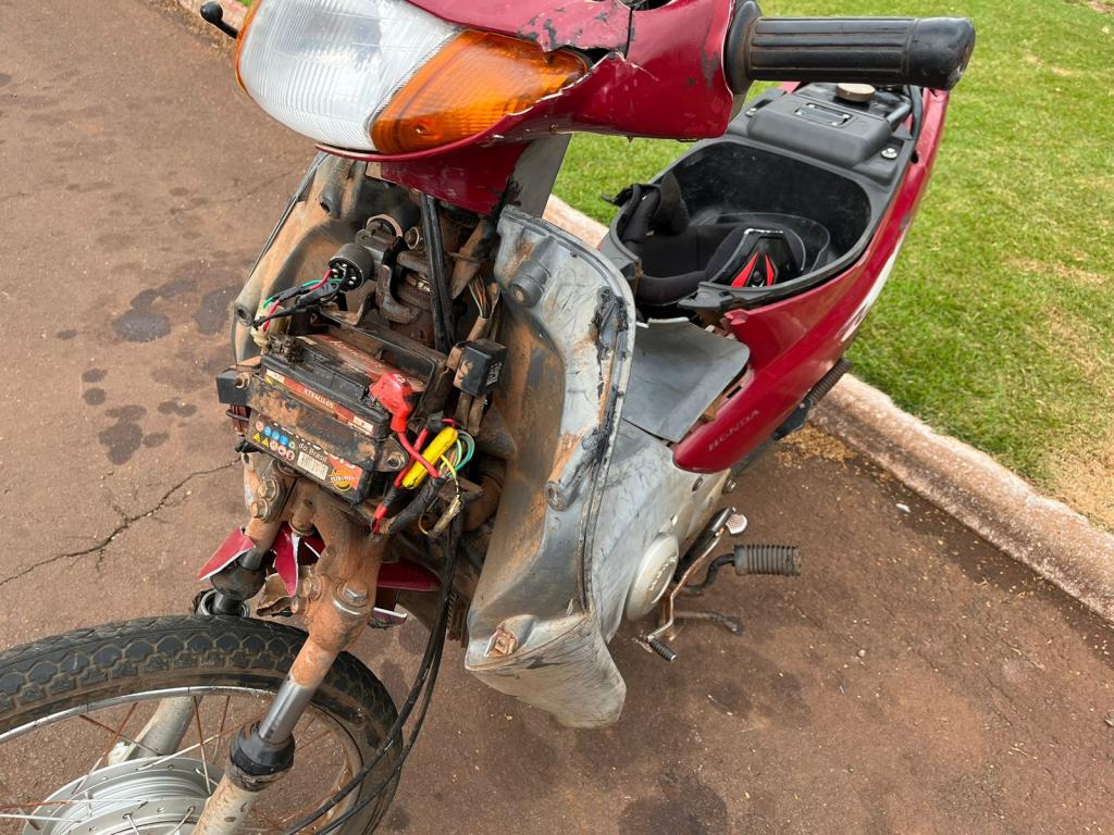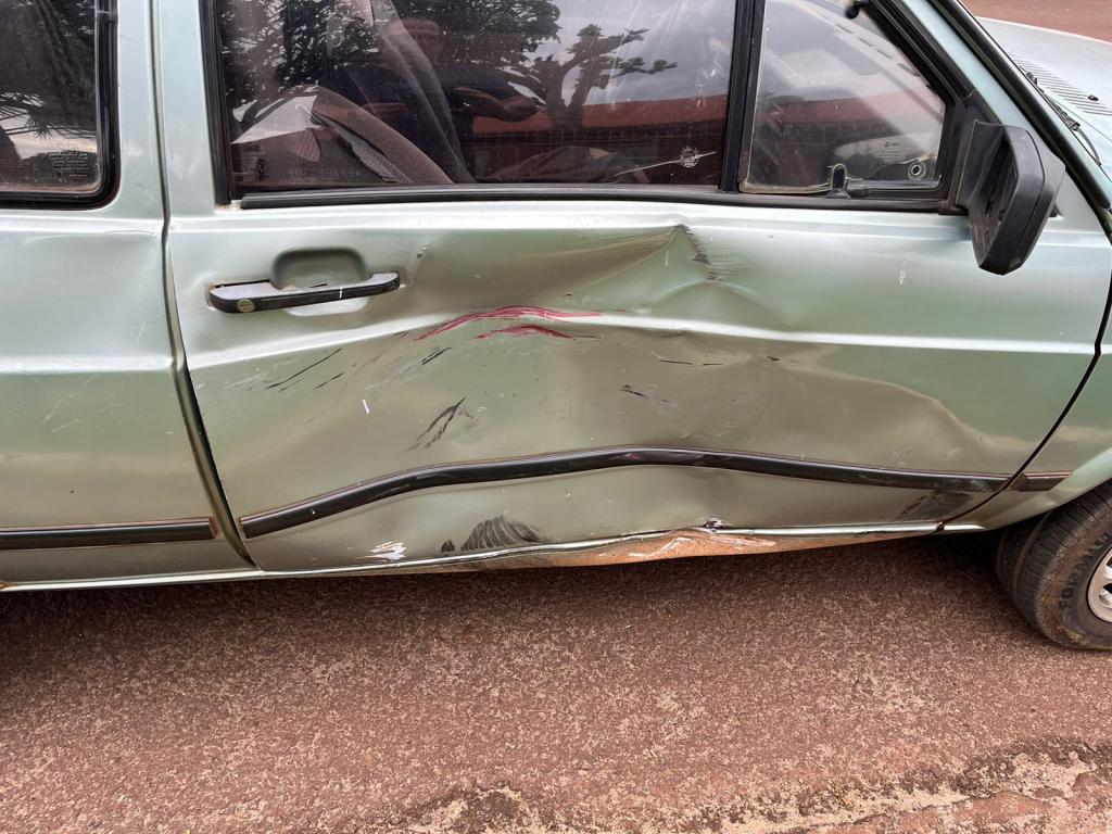 Uma moto Biz colidiu violentamente na porta de um Gol na tarde deste sábado em torno das 16h20, na esquina da rua Toledo com a Porto Lucena, proximidades do Destacamento de Polícia Militar de Nova Santa Rosa.