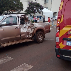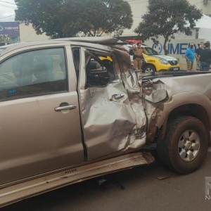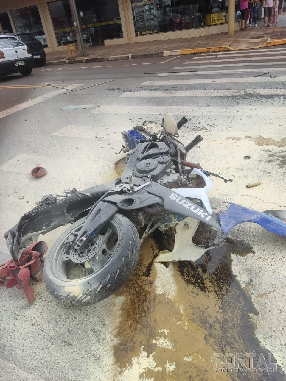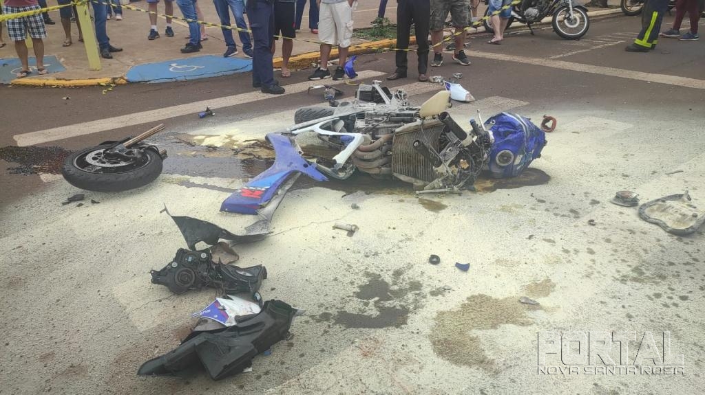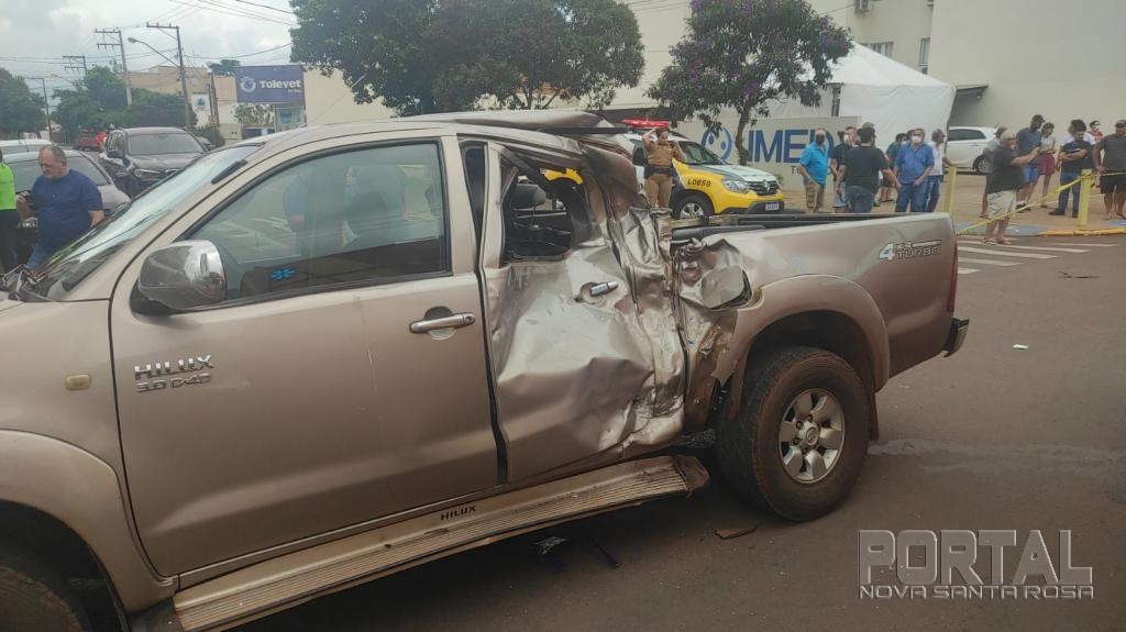 A caminhonete Toyota/Hilux de cor bege seguia pela Rua General Canrobert Preira da Cosa, quando cruzou a rua Santos Dumont, onde seguia o motociclista em alta velocidade, momento em que a moto atingiu em cheio a caminhonete, vindo o motociclista, a parar dentro da caminhonete.