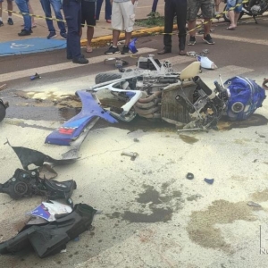 A motocicleta ficou completamente destruída, com várias partes/peças espalhadas pelo local do acidente. Após a colisão ela ainda pegou fogo e teve que ser controlado por extintores de populares que passavam pelo local.