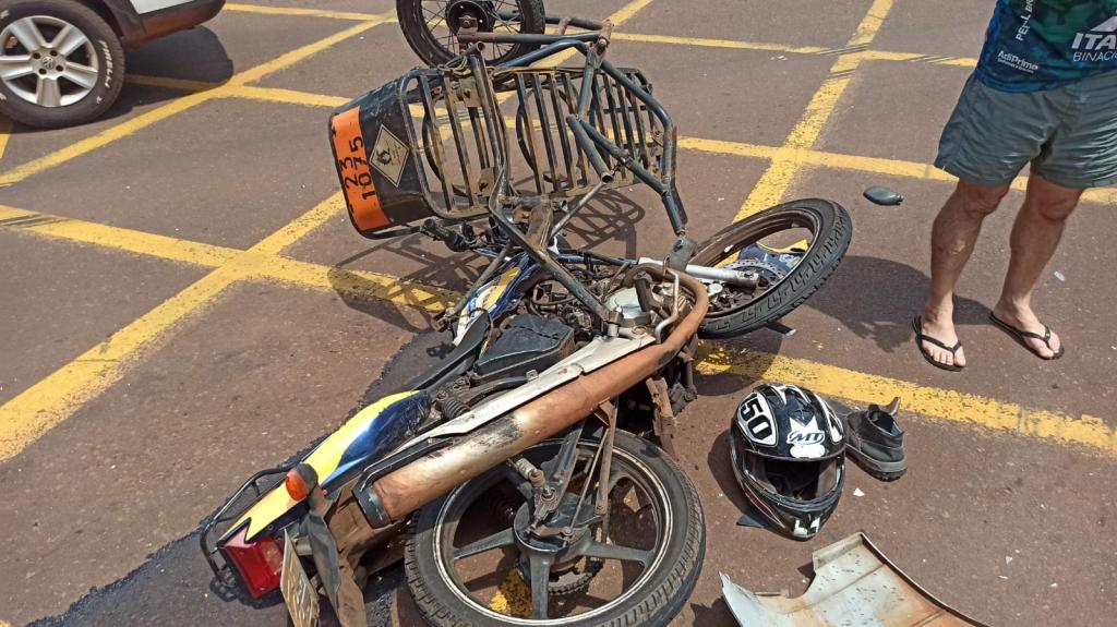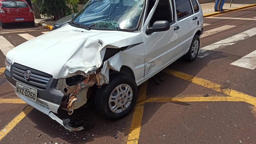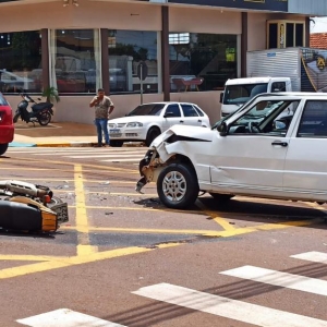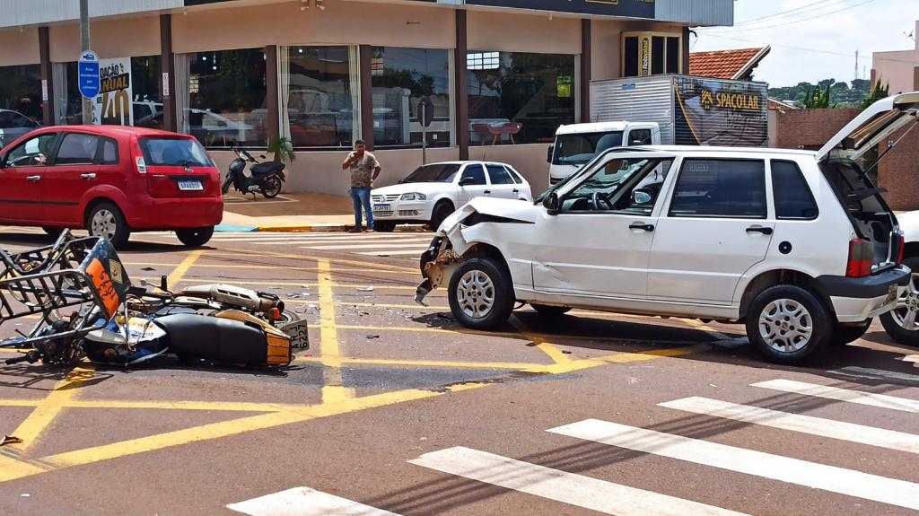 O Fiat Uno de Toledo e a moto Yamaha YBR 125 cilindradas com uma carretinha para transporte de botijões de gás com placa de Marechal Cândido Rondon colidiram na manhã de hoje na rua São João, esquina com a 15 de Novembro, região central de Toledo.