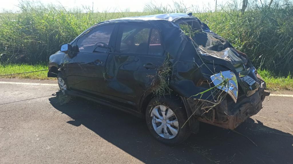 Nas imagens, é possível ver que o automóvel Nissan Tiida, com placas de Joinville (SC), de cor preta, ficou destruído. O condutor fugiu pela área de mata.