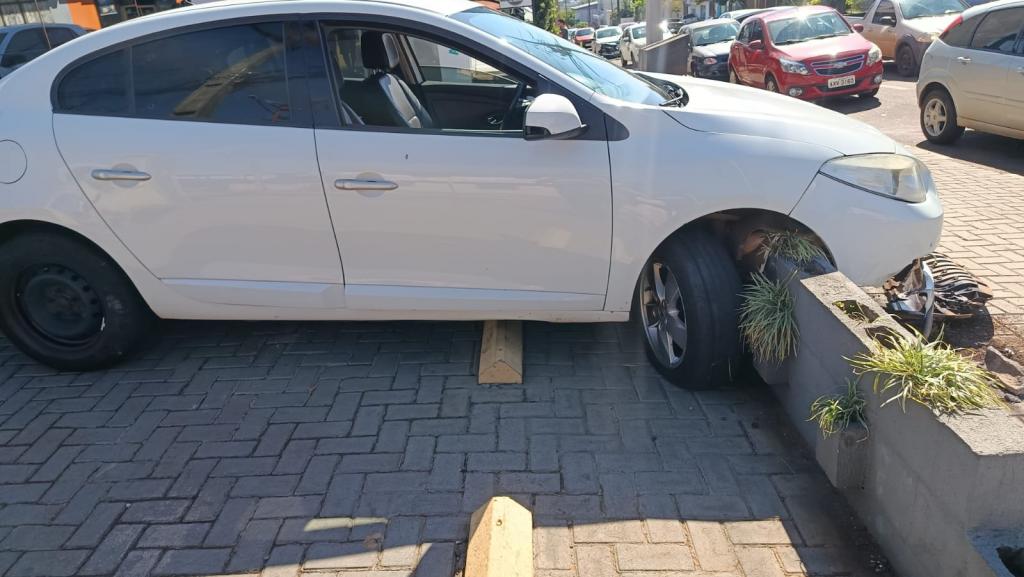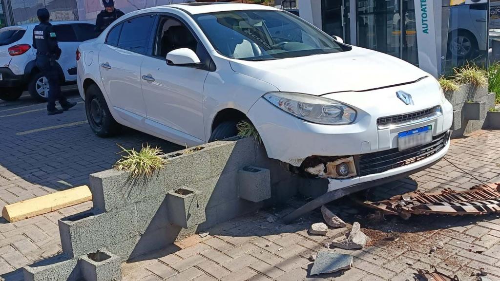 Com isso, o veículo avançou e atingiu a traseira de um Renault Kwid, que estava estacionado em frente à instituição bancária. Em seguida, o Fluence ainda colidiu contra uma mureta, ficando parcialmente suspenso sobre a estrutura.