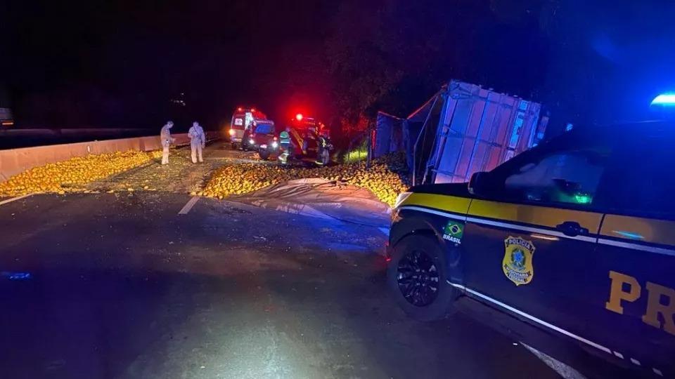 O motorista de um caminhão carregado com laranjas ficou gravemente ferido em tombamento registrado por volta das 19h00 de terça-feira (28), na BR 369, em Cornélio Procópio, no Norte Pioneiro.