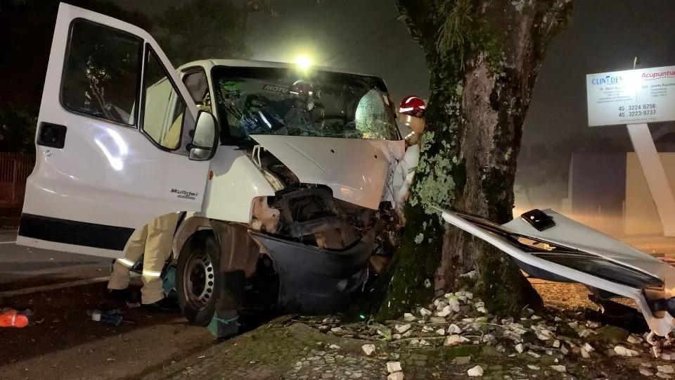 Um rapaz de 24 anos ficou ferido após a van que ele conduzia colidir contra uma árvore na Rua Marechal Rondon, proximidades da Rua Maranhão, no Centro de Cascavel, na madrugada desta segunda-feira (11).