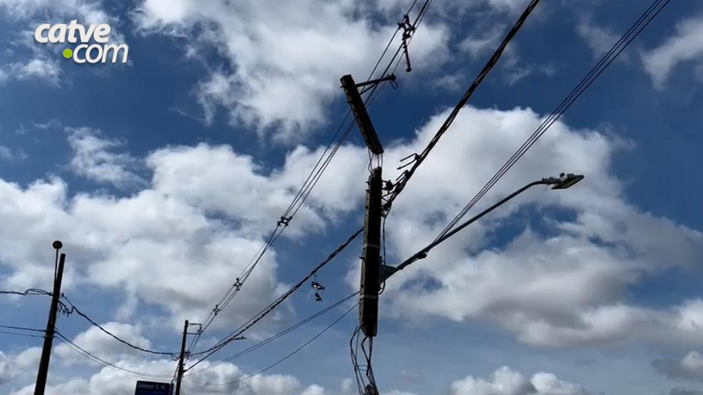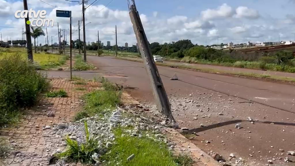 Um poste ficou destruído após uma motorista passar mal e o carro que ela conduzia colidir contra a estrutura na Avenida Guaíra, próximo ao cruzamento com a Rua Guiomar da Costa Marques, no bairro Recanto Tropical, em Cascavel, nesta sexta-feira (9).