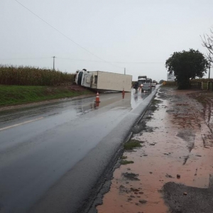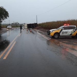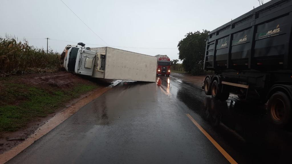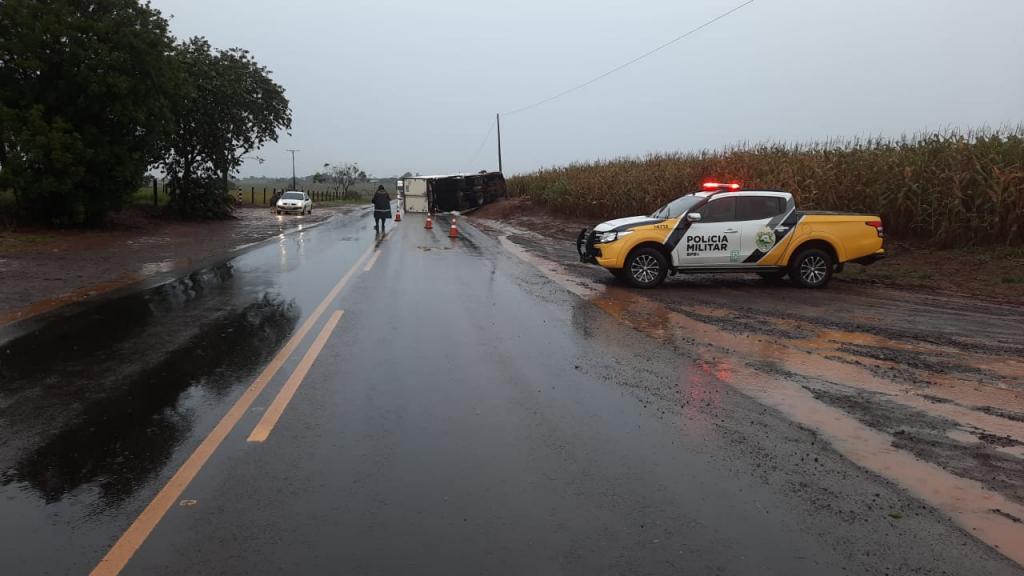 O motorista de um caminhão Ford bau refrigerado perdeu o controle da direção e tombou na rodovia estadual de prefixo PR-182, trecho que liga os município de Palotina e Francisco Alves.