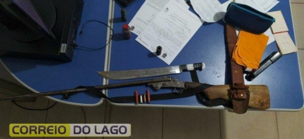 A vítima também relatou que o homem tinha uma espingarda e munições em casa. No local foram apreendidos um facão, uma espingarda, duas munições calibre .44, dois cartuchos deflagrados calibre .36 e acessórios para preparo de cartuchos, que também foram entregues na Delegacia.