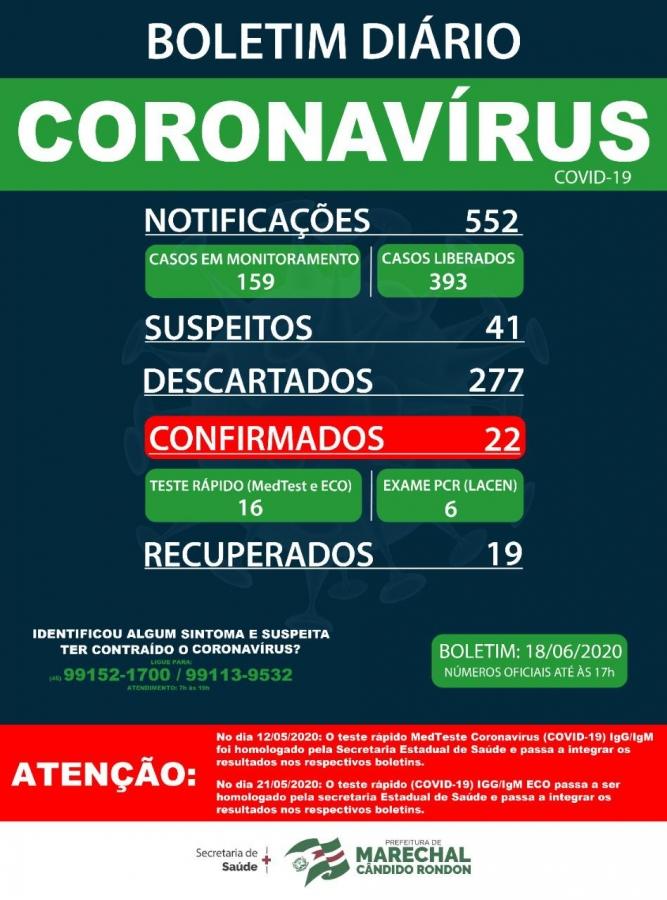O departamento de Vigilância Epidemiológica de Marechal Cândido Rondon divulgou novo boletim, nesta quinta-feira (18), onde consta a confirmação de um total de 22 casos de coronavírus no município. 41 pessoas estão com a suspeita da doença e aguardam resultado de exame.