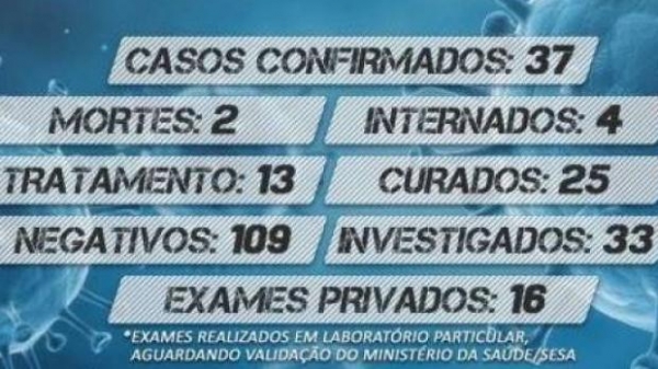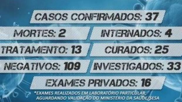 Das 37 pessoas infectadas, 25 foram curadas. No momento, há quatro pacientes internados e 13 estão em tratamento domiciliar com recomendação de isolamento social. Entre as suspeitas registradas, 109 testes e exames tiveram resultados negativos.