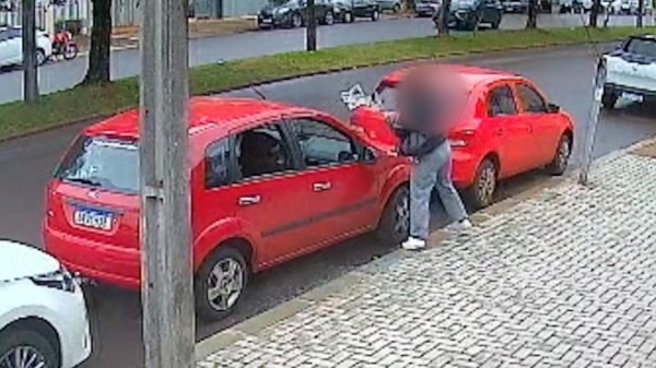 Câmera de segurança flagrou o momento em que mulher danificou o carro do ex-marido, um Ford Fiesta Hatch, na Avenida Toledo, em Cascavel. O caso aconteceu no fim da manhã de segunda-feira (30).