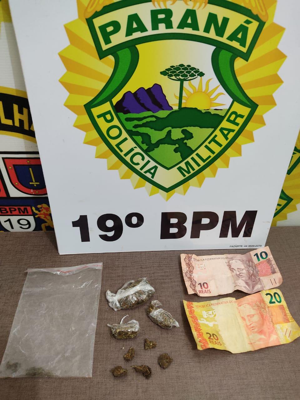 Os policiais após receber a denúncia se deslocaram até a praça e abordaram a suposta denunciada juntamente com um grupo de três homens os quais relataram ser usuários de drogas, na bolsa da denunciada, foi localizada a quantia de aproximadamente 12 gramas de maconha, sendo três invólucros embalados e prontos para o comércio, e resquícios da substância, além de R$ 30,00 em espécie;