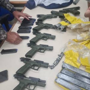 Um kit rajada e oito pistolas turcas com numeração raspada e 16 carregadores foram apreendidos presos ao corpo de uma mulher na Ponte da Amizade, em Foz do Iguaçu (PR), na manhã desta terça-feira (4).