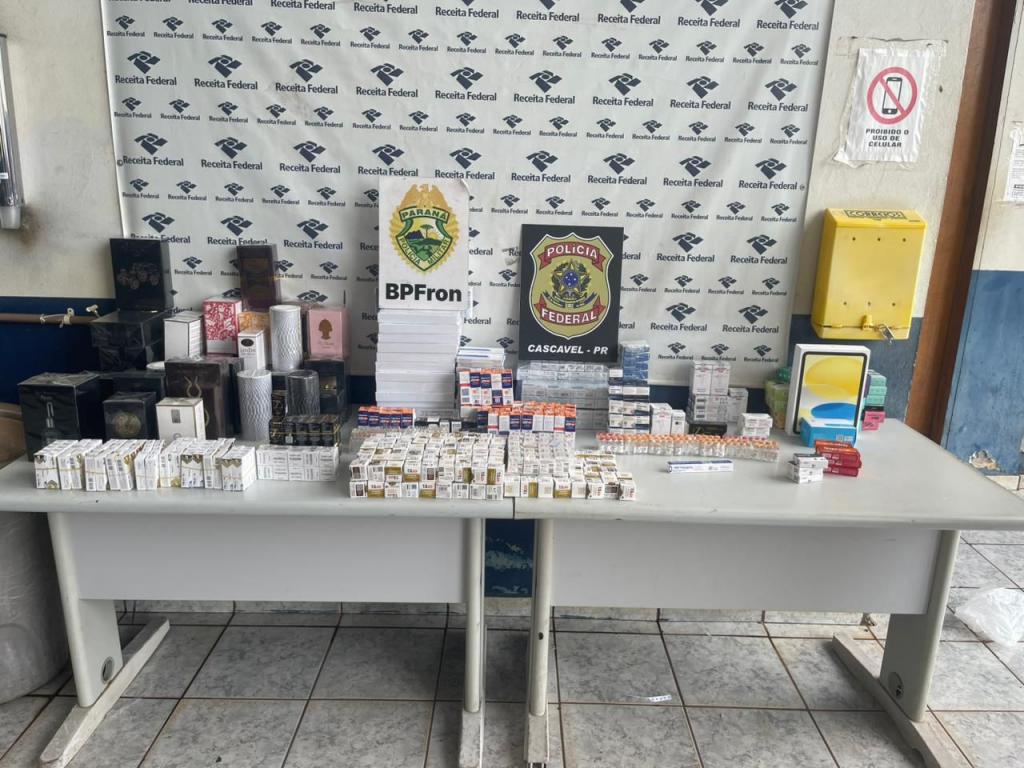 Em buscas no interior do veículo, tanto no compartimento de passageiros quanto no bagageiro, os agentes localizaram duas malas e duas bolsas pertencentes à passageira. Dentro das bagagens havia uma grande quantidade de produtos oriundos do Paraguai.