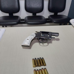 Diante disso, foi realizado a busca veicular e encontrado dentro do console central um revólver calibre .32 marca Taurus desmuniciado.