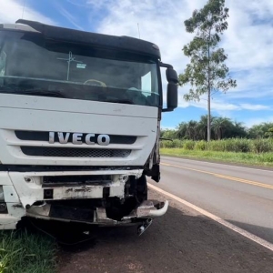 Conforme a corporação, o carro com placas de São Paulo, atravessava a pista no trevo quando foi atingido pelo caminhão.