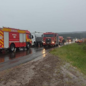 Uma mulher, de 58 anos, morreu em meio às ferragens em acidente de trânsito entre carro e caminhão na PR-280, em Flor da Serra do Sul, no Paraná, na manhã desta quinta-feira (9). Um jovem se feriu gravemente.