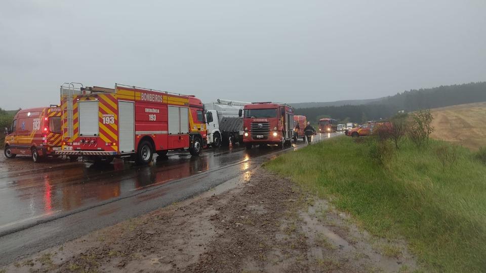 De acordo com o Corpo de Bombeiros, o automóvel Volkswagen Voyage bateu contra a frente de um caminhão Volkswagen, conduzido por um homem de 60 anos, que não sofreu ferimentos.