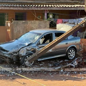 Já o carro ainda atingiu um poste e o muro de uma residência, quebrando ambas estruturas. O condutor se evadiu.