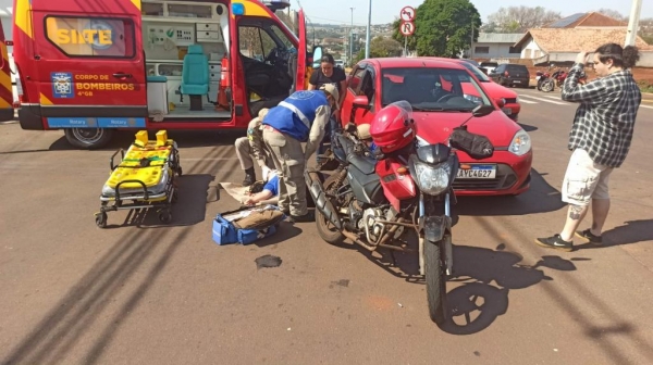 Um acidente entre um carro e uma moto aconteceu na tarde de hoje (15), segunda-feira, no cruzamento da avenida Maripá com rua Almirante Tamandaré no centro de Toedo.