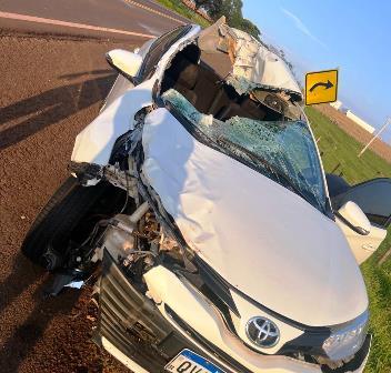 Uma mulher ficou gravemente ferida após um veículo Toyota Yaris bater contra um cavalo na BR-272, em Goioerê-PR, na manhã desta segunda-feira (4), às 6h.