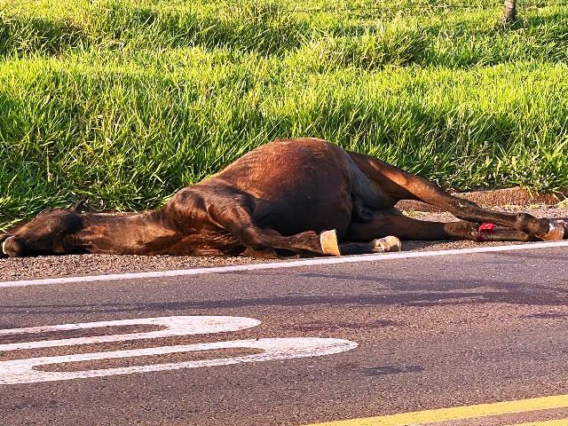 A colisão aconteceu no início da manhã, mas o veículo e o cavalo ainda estão no local e o trânsito é lento na rodovia.