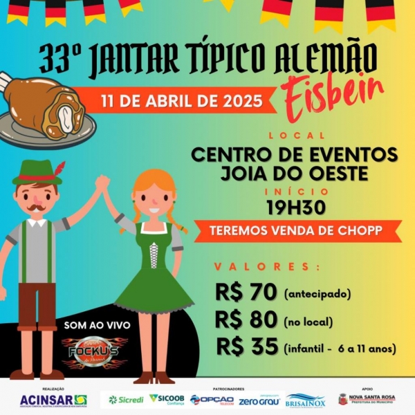 A ACINSAR - Associação Comercial, Industrial e Agropecuária de Nova Santa Rosa - realizará no dia 11 de abril (sexta-feira), no Centro de Eventos Joia do Oeste, o 33º Jantar Típico Alemão EISBEIN. Você não pode ficar de fora em!