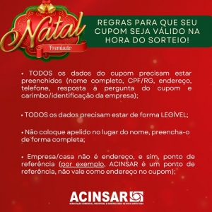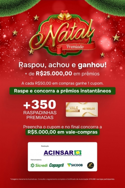 A tradicional campanha Natal Premiado, promovida pela ACINSAR (Associação Comercial, Industrial e Agropecuária de Nova Santa Rosa), está movimentando o comércio local neste fim de ano. Com mais de R$ 25 mil em prêmios, a promoção busca incentivar as compras no município e premiar os consumidores.