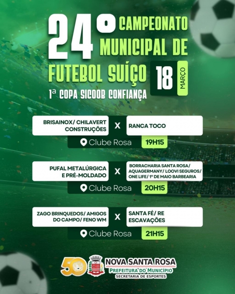 O futebol suíço volta a ser destaque em Nova Santa Rosa nesta terça-feira (17), com mais uma rodada do 24º Campeonato Municipal – 1ª Copa Sicoob Confiança. A programação reúne três jogos no Clube Rosa e promete movimentar atletas e torcedores.